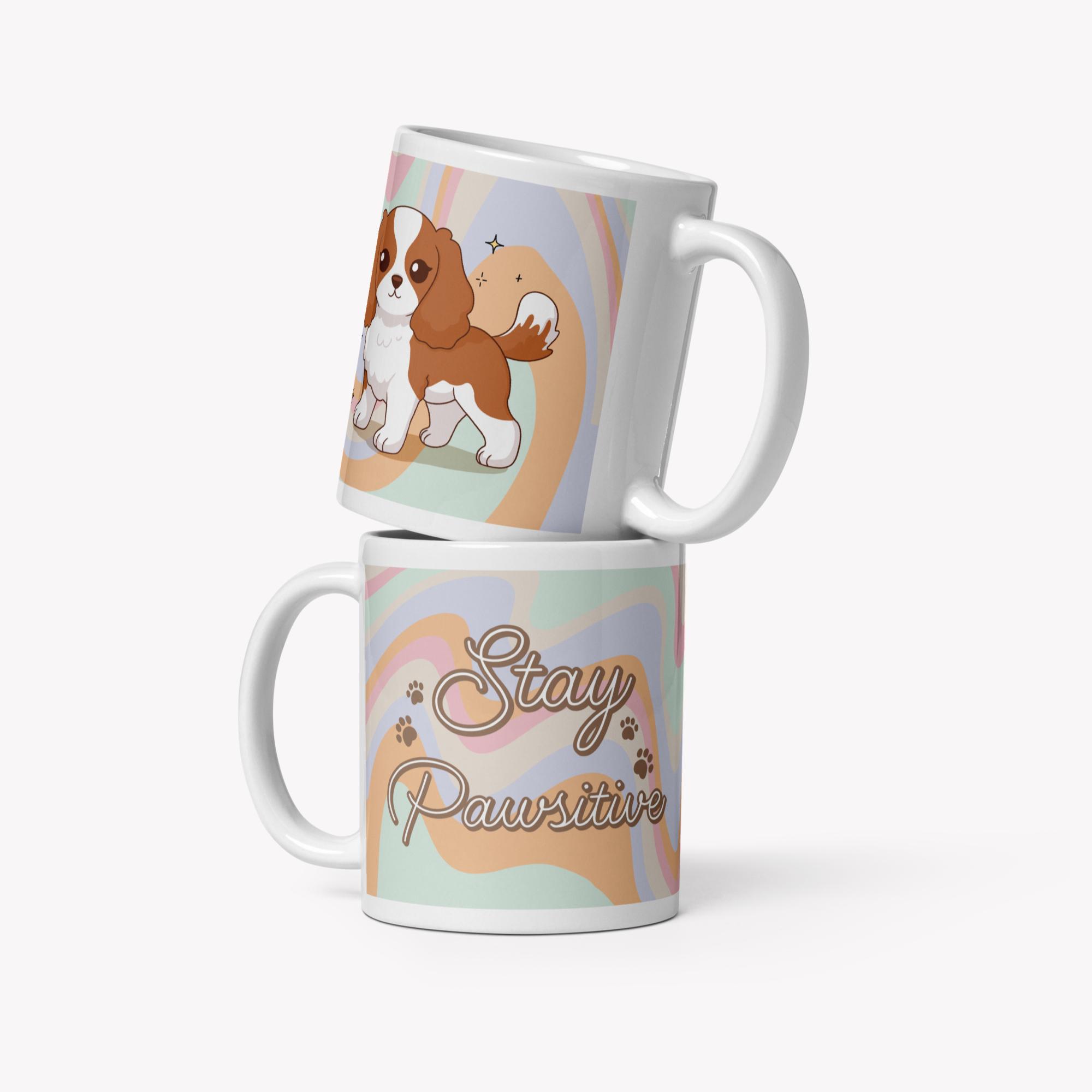 Ilustrada à mão com muito amor, tem de um lado um patudo adorável e do outro a frase inspiradora: “Stay Pawsitive” 💛